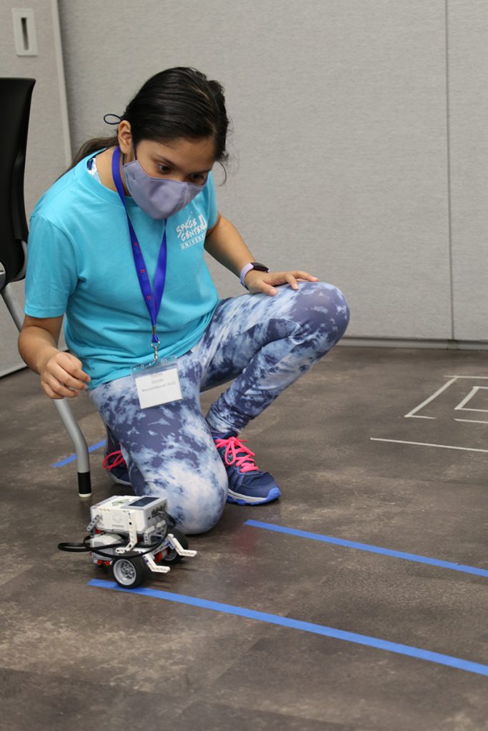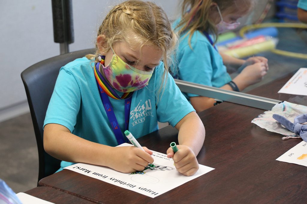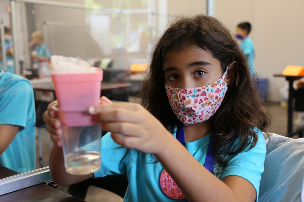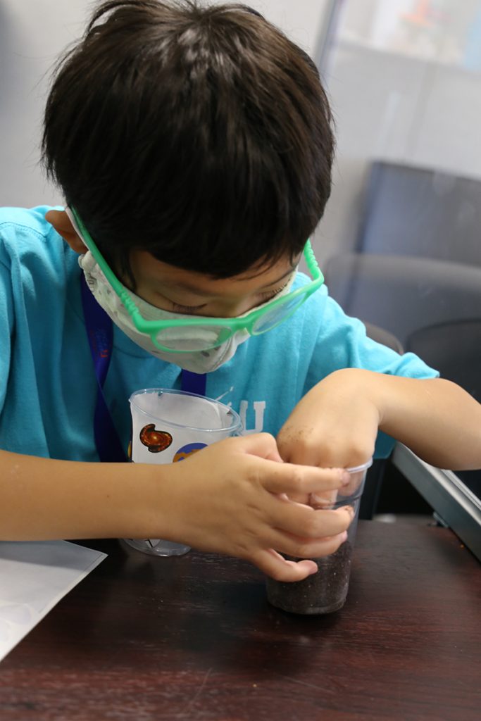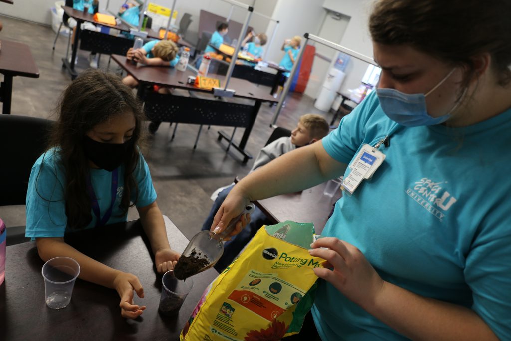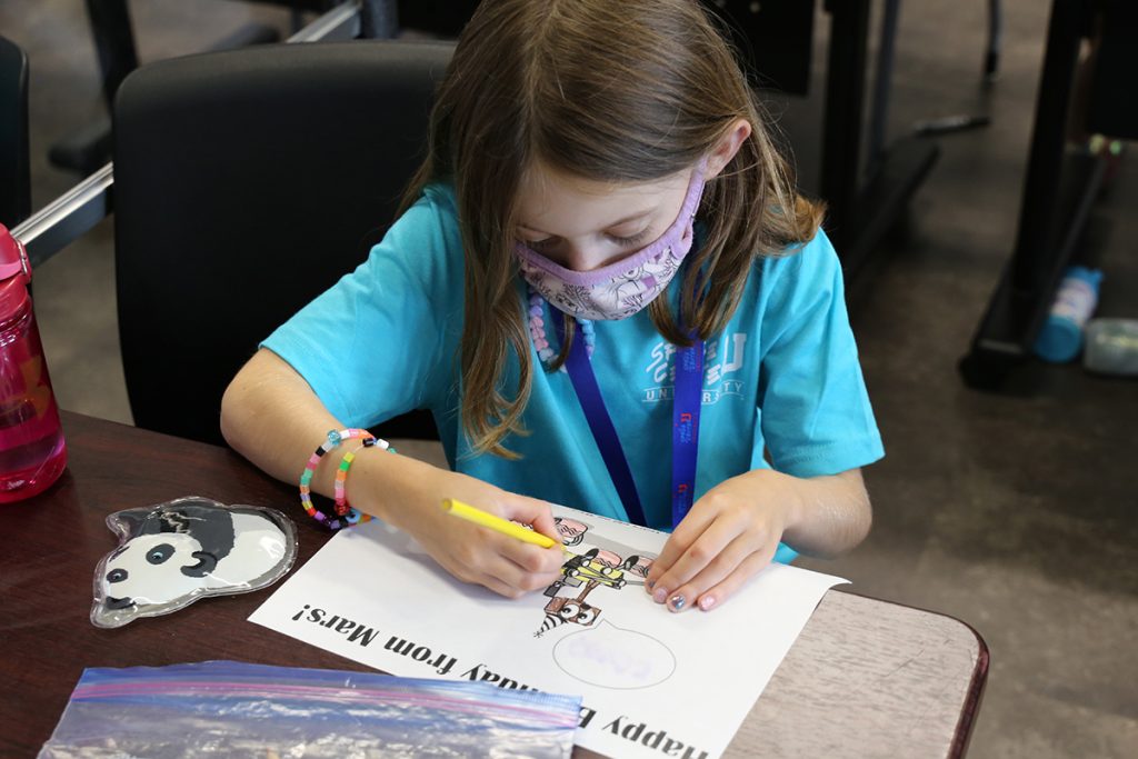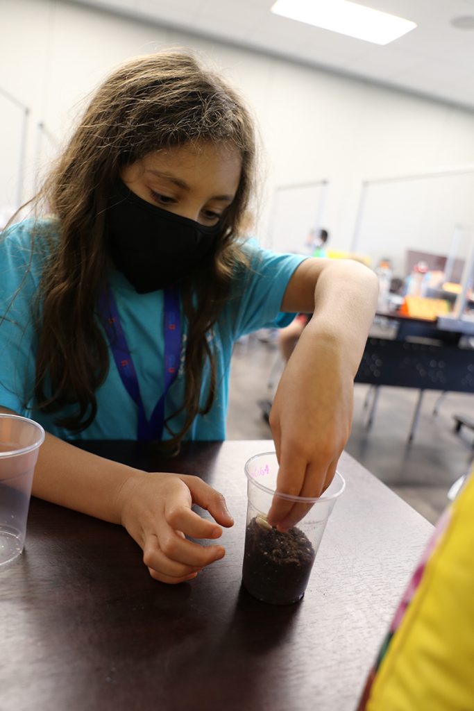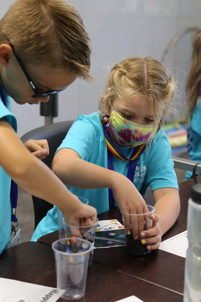 Campers are learning about long-duration space survival by designing water purification systems and building terrariums. They are working together to program robots to navigate a specific course. The students are learning about our solar system by calculating when their next birthday would be on other planets. They are also learning about chemical reactions by mixing ingredients to create glow-in-the-dark slime, which they charge in sunlight.