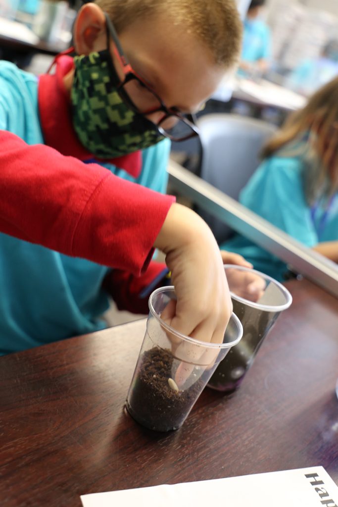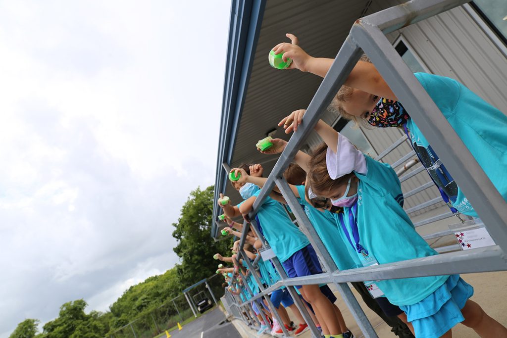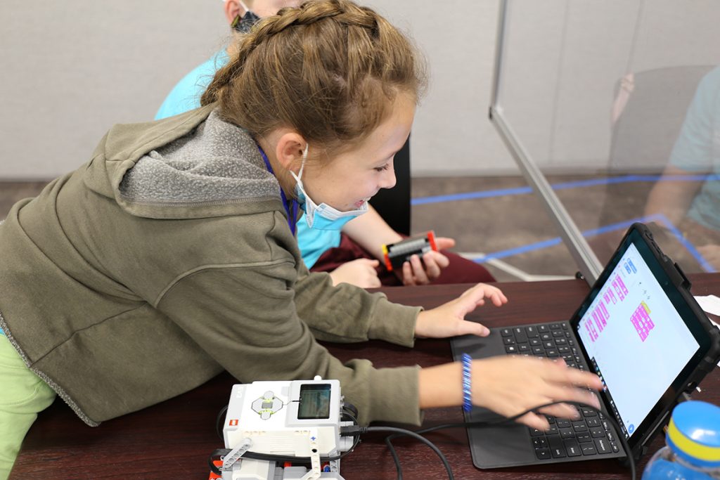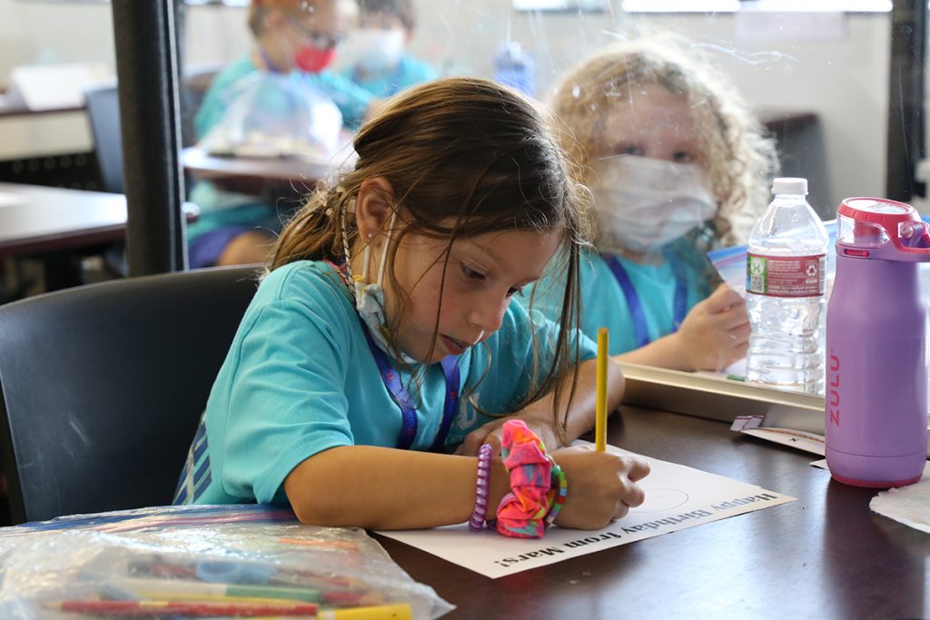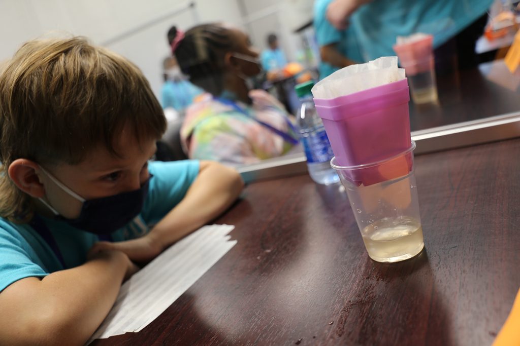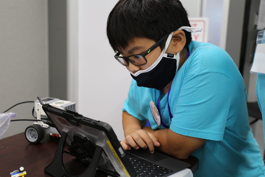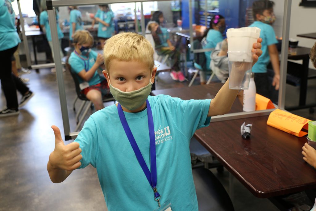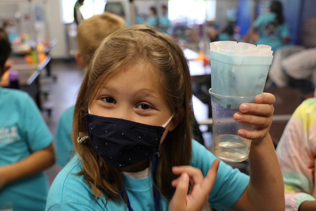 Campers are learning about long-duration space survival by designing water purification systems and building terrariums. They are working together to program robots to navigate a specific course. The students are learning about our solar system by calculating when their next birthday would be on other planets. They are also learning about chemical reactions by mixing ingredients to create glow-in-the-dark slime, which they charge in sunlight.