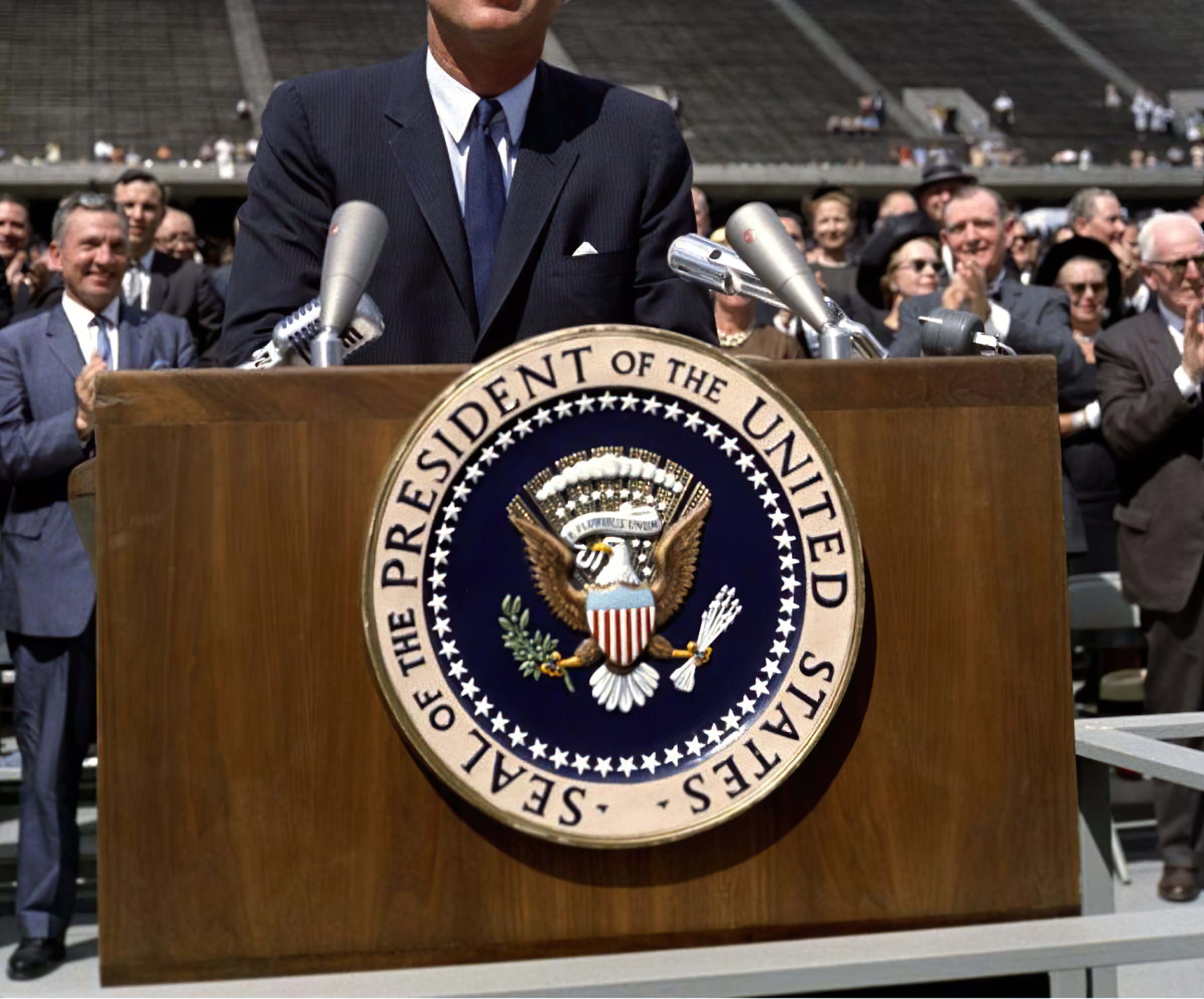 This specific lectern has graced the presence of several historical figures, including President Eisenhower, President Jimmy Carter, then-Vice President Lyndon B. Johnson and NASA administrator James E. Webb. However, the most famous and well-documented instance of its use was during President John F. Kennedy’s iconic “moonshot” speech on September 12, 1962 at Rice University in Houston, Texas.