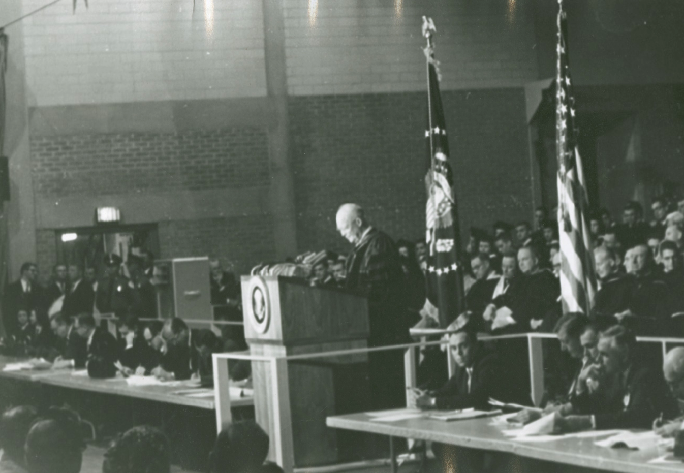 President Dwight D. Eisenhower addresses the convocation in William M. Rice Institute’s Autry Court on October 24, 1960. He is standing at a podium. A crowd of people are seated behind and next to him. / Source: “President Dwight D. Eisenhower speaking at Autry Court, Rice University.” (1960) Rice University: https://hdl.handle.net/1911/70616.