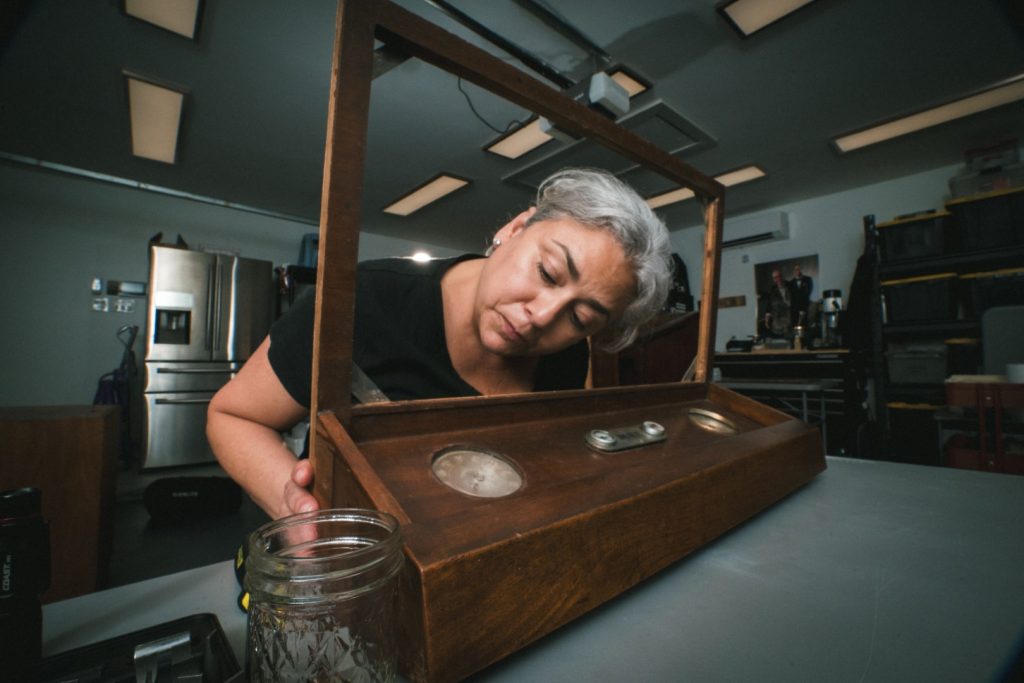 The JFK lectern’s adjustable mechanism is far from the first surprise found in our artifacts. The Skylab 1-G Trainer on display at Space Center Houston is the exact equipment that all three Skylab crews used from 1972-1973 to prepare for life in Earth’s orbit. So it’s fitting that when our Collections and Conservation team began their months-long assessment of the trainer, they found that many cabinets and storage lockers still contained items like what would have been used on Skylab in space: medical equipment, water filters, human waste disposal bags, food storage containers and checklists. Even a Coronagraph Containment Measuring device was discovered, which astronauts used to study what particles might be floating around in Skylab.