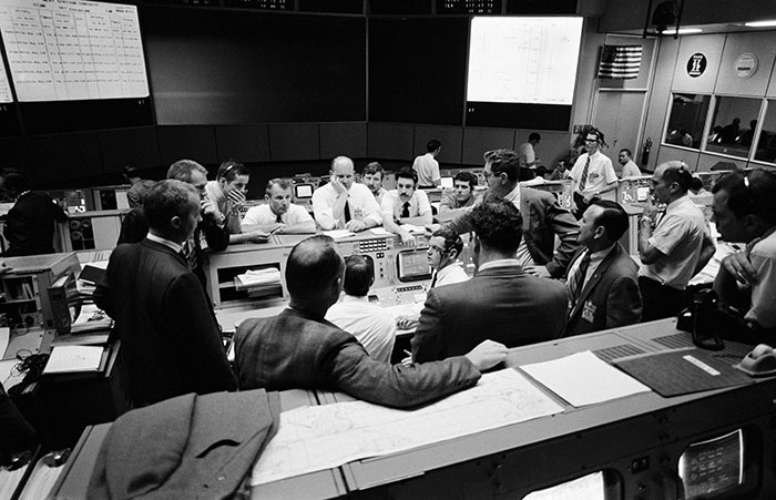 Date Created: 1970-04-16 Overall view showing some of the feverish activity in the Mission Operations Control Room (MOCR) of the Mission Control Center (MCC) during the final 24 hours of the problem-plagued Apollo 13 mission. Here, flight controllers and several NASA/MSC officials confer at the flight director’s console. When this picture was made, the Apollo 13 lunar landing had already been canceled, and the Apollo 13 crewmembers were in trans-Earth trajectory attempting to bring their crippled spacecraft back home.