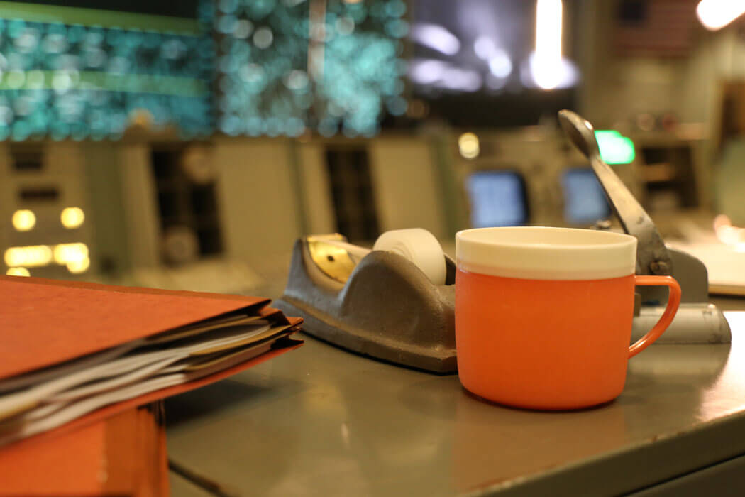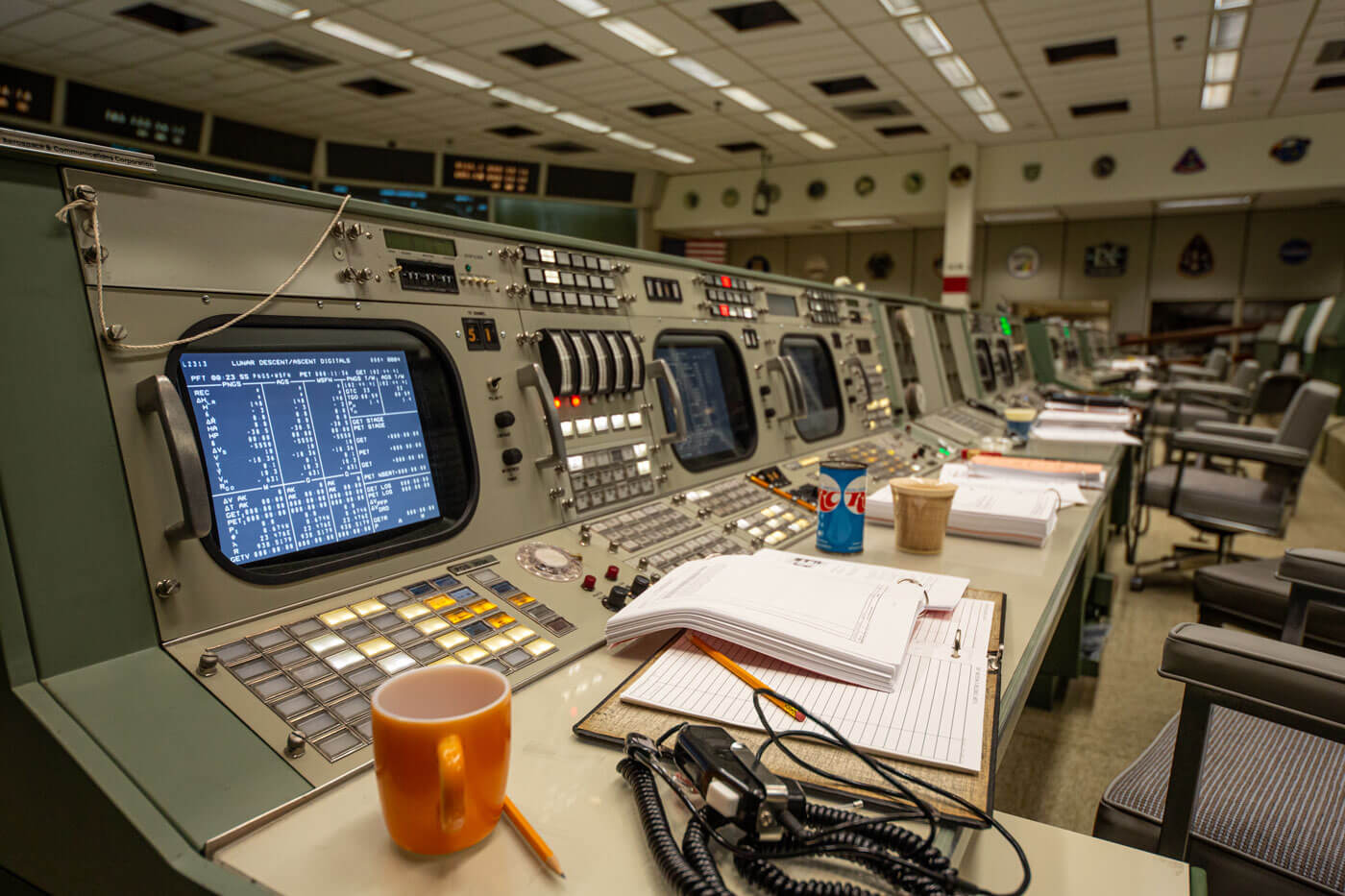 The front row of controllers in Historic Mission Control was referred to as “The Trench” by the flight controllers. Each control station was responsible for a different aspect of a mission. From left to right, the stations are Booster System Engineer, Retrofire Officer, Flight Dynamics Officer and Guidance Officer. Of the hundreds of buttons and controls located at these stations, many have gone missing or have become faded after decades of use. Some of the work stations are even held together by tape.