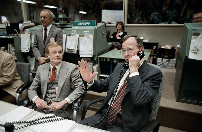Vice President George Bush talks to the Earth-orbiting STS-6 astronauts from the spacecraft communicators; (CAPCOM) console in the mission operations control room (MOCR) of the Johnson Space Center’s mission control center. Astronaut Roy D. Bridges, is one of the CAPCOM personnel on duty. JSC Director Gerald D. Griffin, left, watches a large monitor (out of frame) on which the TV scene of the four-member Challenger crew is visible.