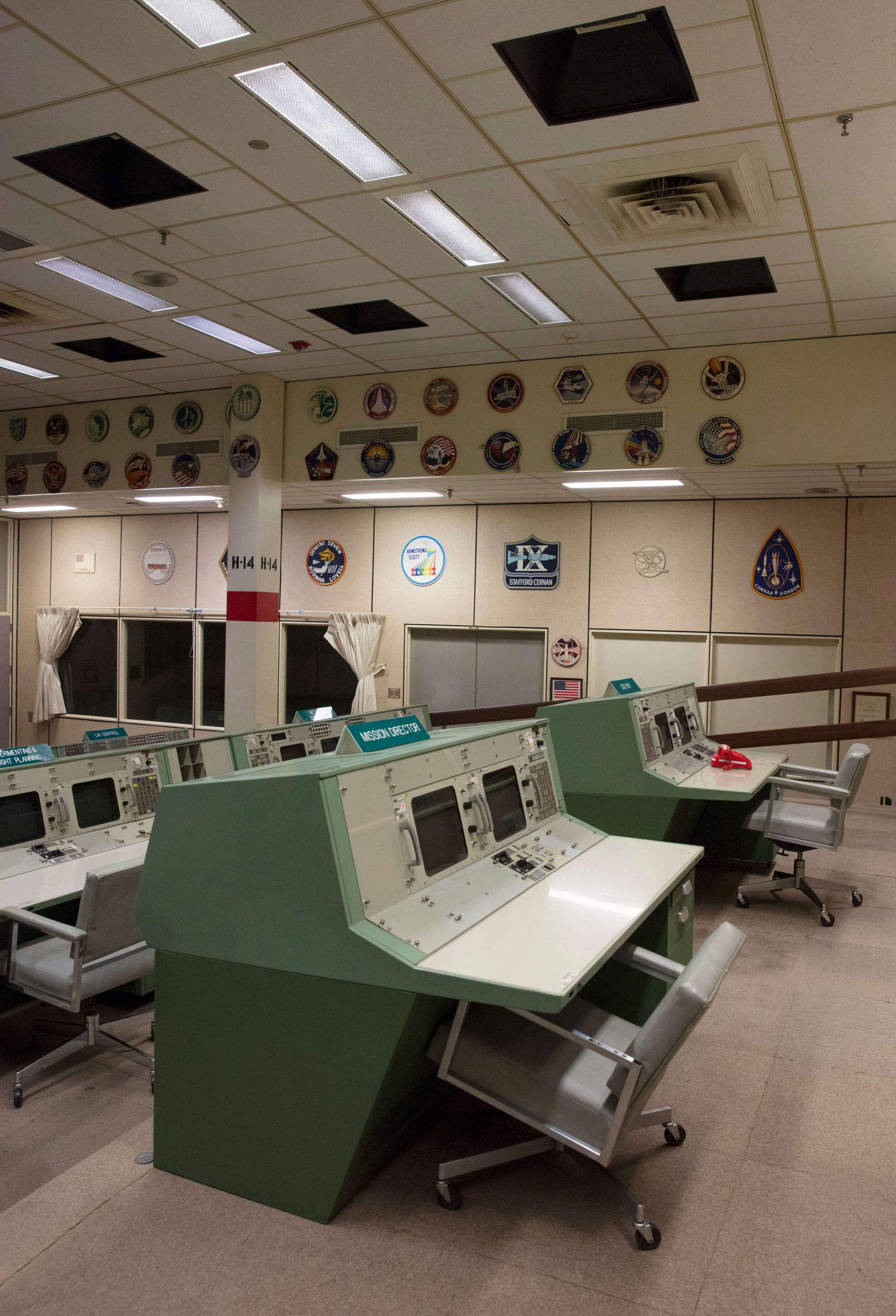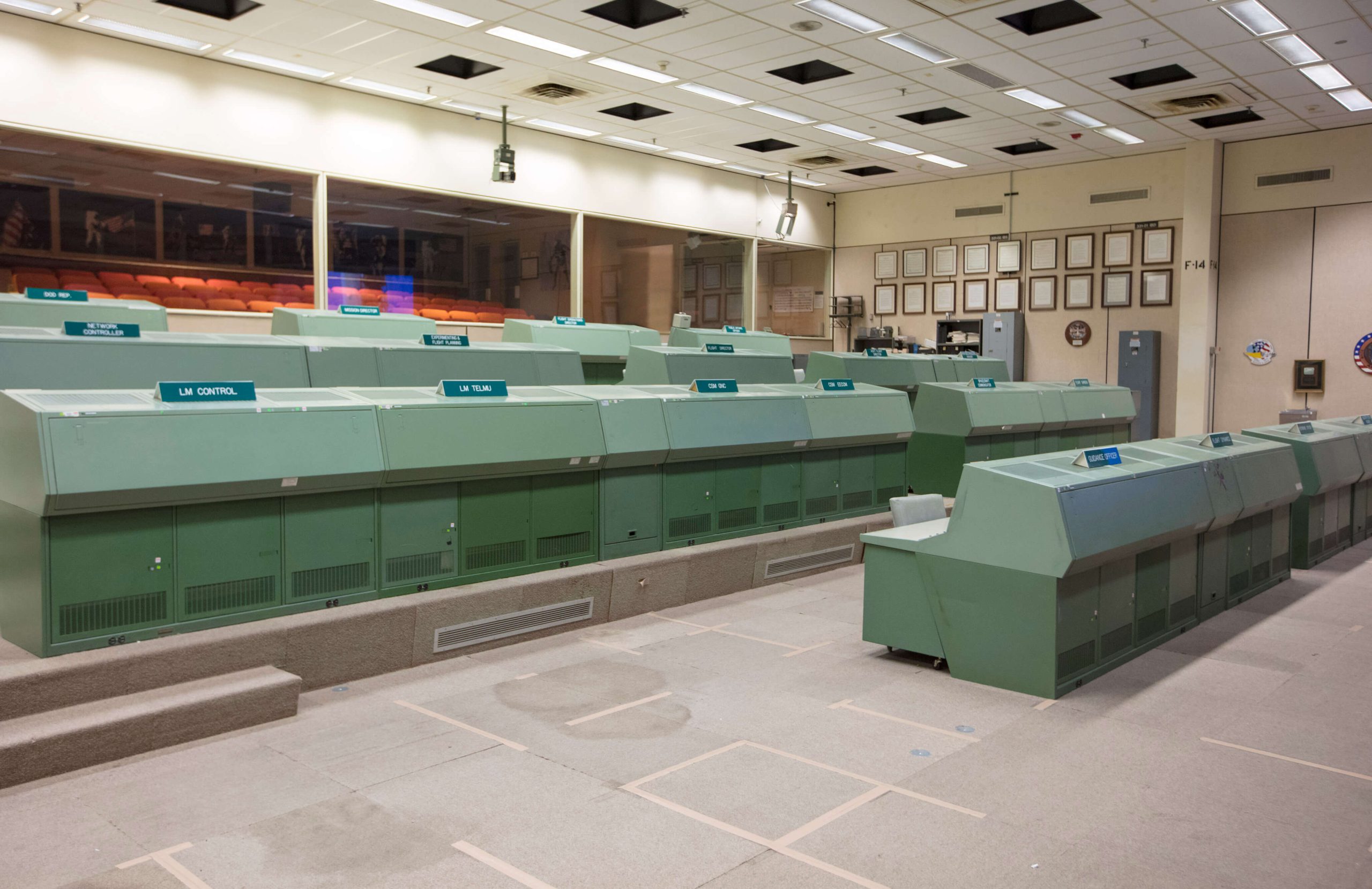The last row in Historic Mission Control hosted the stations of Public Affairs Office, Director of Flight Operations, Mission Operations Directorate and Department of Defense. The iconic red phone located at the Department of Defense station was used to directly call the Navy when a capsule returning to Earth was about to splashdown. On the right is the viewing room of 74 seats that hosted the families of astronauts and special guests.