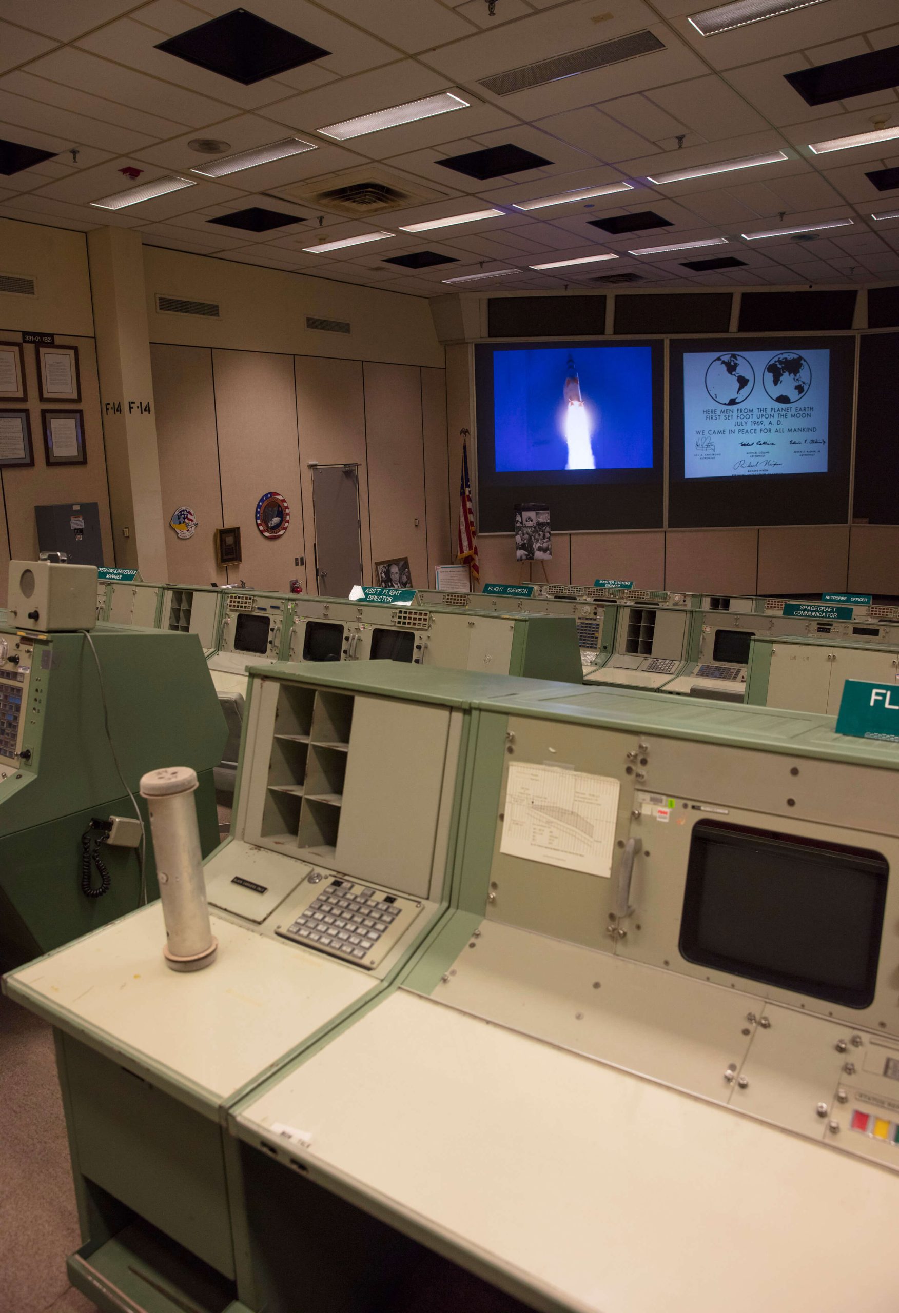 See the restored Apollo Mission Control Center with the actual flight control consoles brought back to life. The five large screens across the front of the room have been reactivated with projections to recreate the exact images seen during the Apollo 11 mission. See the console buttons illuminated and furnishings on the consoles including flight control manuals, ashtrays, pens, maps, coffee cups and headsets.